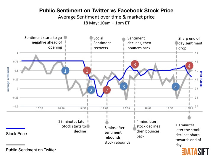 Basically, DataSift notes, every time the volume of negative chatter on Twitter increased, Facebook’s stock price dropped within 20 minutes. “So if people had traded based on signals today to buy/sell Facebook stock,” the company told us,”they might have done quite well.”