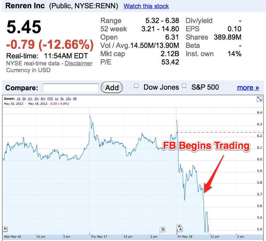 Update: Renren is recovering, It’s now down just 1.16% from yesterday, compared to its place down 12.66% 14 minutes after Facebook began trading.