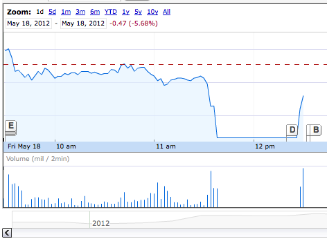 While Facebook is closing almost exactly on its original price of $38 per share, Zynga closed down 13.4% after some wild fluctuations earlier today. A single large shareholder sold off around 11:17 Eastern time this morning, sending the price to $7.17. That immediately triggered the “circuit breaker” rule that NASDAQ and other stock exchanges have set up — if a single stockholder conducts a sale or purchase that sends a stock’s price up or down by more than 10%, it will place a temporary hold on trading.