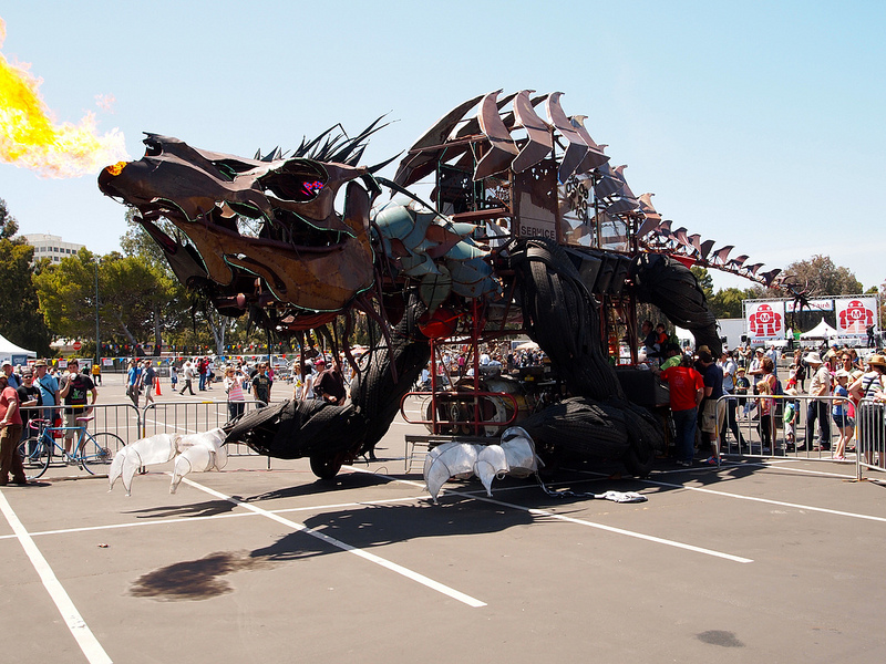 A life-size fire-breathing dragon. A fully robotic calliope band. A full-scale flight simulator built by teenagers. An entire herd of homemade R2-D2s. Electric cars, steampunk fashion, a robot petting zoo, a piano made of bananas, and a cardboard Trojan Horse. Plus a zillion different interactive attractions, classes, and events for kids of all ages. Yes, the Maker Faire is back in town, and only just in time.