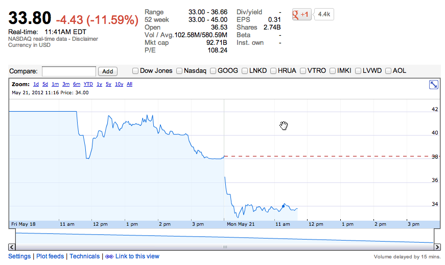 Facebook shares dropped nearly 12 percent to $33.76 — below the company’s final $38 price in the company’s highly anticipated initial public offering last week. Today is an interesting test for Facebook’s worth because the company’s shares will no longer be supported as heavily by the IPO’s lead underwriter Morgan Stanley.