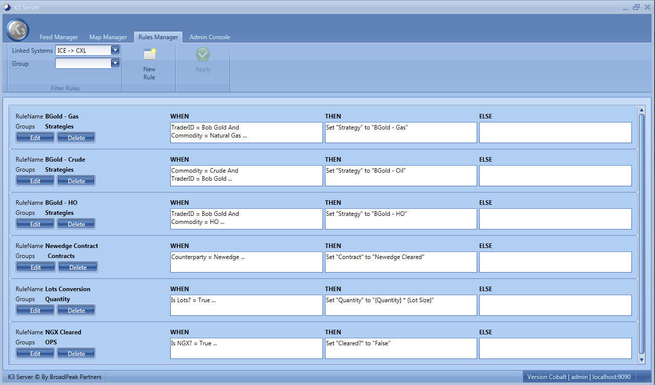 But while the main data highway, so to speak, is set up by IT, the interesting thing about K3 Server is how the data is handled afterwards. In a traditional environment every little tweak or adjustment would have users scrambling back to developers with a change request. But K3’s “Rules Manager” offers a GUI interface that lets end-users customize their own “if/then” statements for how the data needs to be enriched afterwards (add this reference, set this field, e.g.)