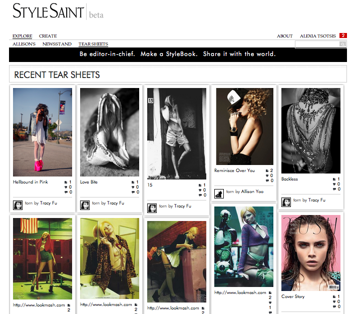 To use StyleSaint in its current form, log in with Facebook or Twitter and create an account, once logged on, you can choose from over 55K “tear sheet” images from which to create your own Stylebook, once you’ve got more than ten tear sheets loaded, you can hit the “Create Stylebooks” link in the top right and StyleSaint will automatically import, then publish, the last ten sheets you’ve torn. Alternatively you can drag-and-drop the tears to create a custom stylebook. Click on “Create” to publish to the site.