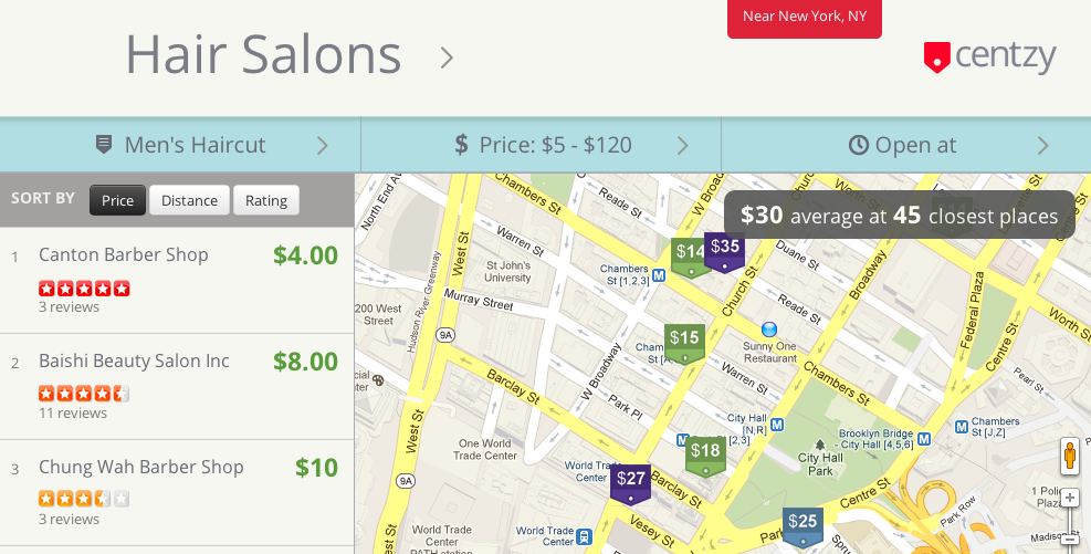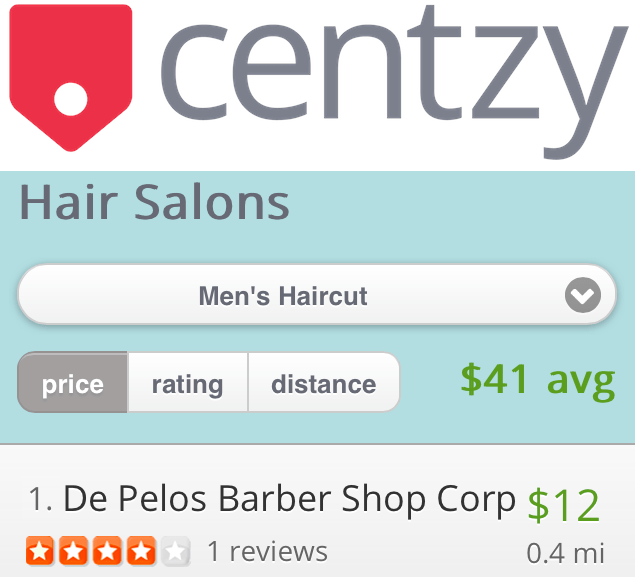 For today’s launch, though, Centzy’s web and mobile sites let you search for hair salons, gyms, museums, oil changes and more business types, and sort by price, distance, open hours, and average rating. Listings appear on a map and you can select which product’s price you want to search for. More business types are on the way.
