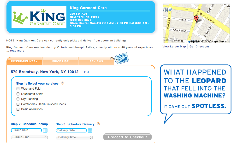 Sure, you can get a bag of clothes picked up, washed, and dropped back off, but there’s no service that aggregates all of your nearby dry cleaners and compares prices, available pick-up/drop-off times, and books it for you (Seamless-style). But no more — SpotlessCity is finally here.