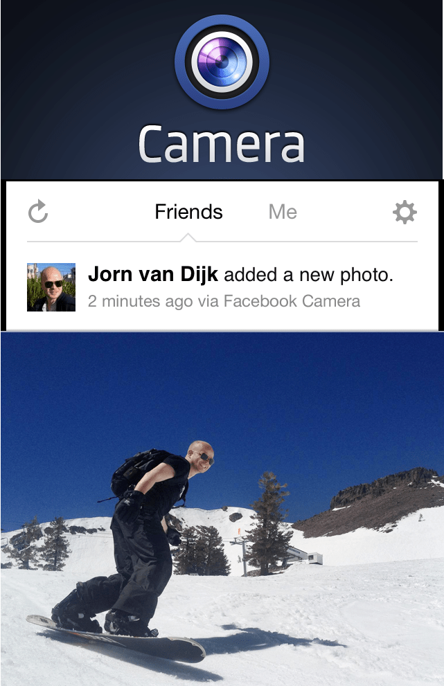 The app’s homescreen includes a camera button for shooting new photos, and quick access to the last few images in your camera roll for instant uploading. By default you’ll see a feed of photos from your friends that’s basically your news feed but only photo posts. You can also view a feed of just photos you’ve taken or been tagged in. The feeds update in real time, you can Like with a single click, and the comment button pops up as an overlay rather than forcing you to load a separate screen. The browsing experience is smooth, though browsing can only be done in portrait mode so standard photos appear square with their sides or top and bottom cut off. You have to click them and sometimes turn your device to view them in full.