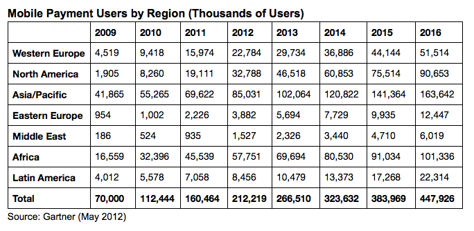 — Regional breakdown. North America may make the most noise, but by 2016 it will only be the third-largest market for mobile payments, Gartner says. Asia Pacific will be the biggest region, with Africa at number-two, with the pair accounting for more than 60 percent of all mobile payments in four years. The full table below