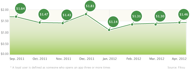 Meanwhile in April, the Cost per Loyal User Index rose by 12.3% to $1.46, up from $1.30 in March. February was practically the same as March at $1.31, a bump up from January’s $1.14. Typically the first quarter is a quieter period for marketers, says Fiksu, so April’s aggressive spending by marketers is not that unusual, especially when combined with the dynamics in the top categories of games and social networking in the month.