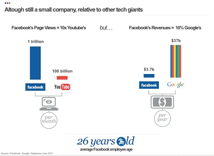 In 94 fairly packed slides (no Kreiger approach here), there is a huge amount of data, occasionally usefully visualizing some of the biggest challenges the company faces. (Example: Facebook’s monetization issue. It is getting ten times more traffic than YouTube, but only one-tenth the revenue of YouTube’s owner, Google.)