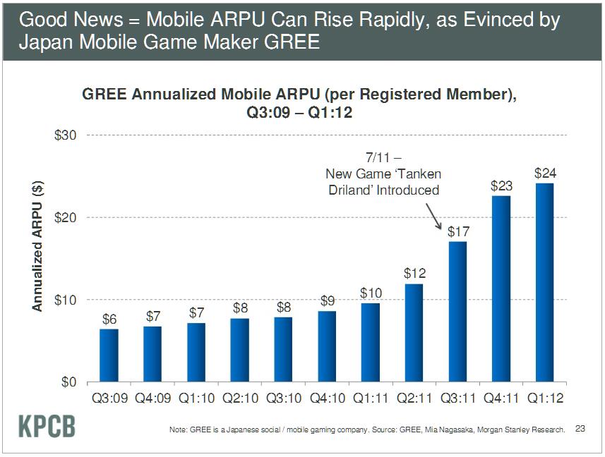 Meeker, however, highlighted that some companies, including Japanese social/mobile gaming company GREE, which managed to increase its average revenue per registered member from just $10 in early 2011 to over $24 in the first quarter of 2012. Another Japanese mobile gaming company, CyberAgent, now sees a higher mobile ARPU than on the desktop.