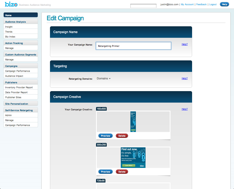 As for the self-serve product, VP of Product Management Chris Mann says that for the most part, it should help Bizo reach a new customer base, including marketers for smaller businesses with more limited budgets, “who are just now getting their arms around how to add online display to their marketing mix.” Mann says the new product includes the same retargeting capabilities that Bizo uses in its own campaigns, except that it can’t target people who visited specific pages on a website. (Bizo plans to add that capability in Q3.)
