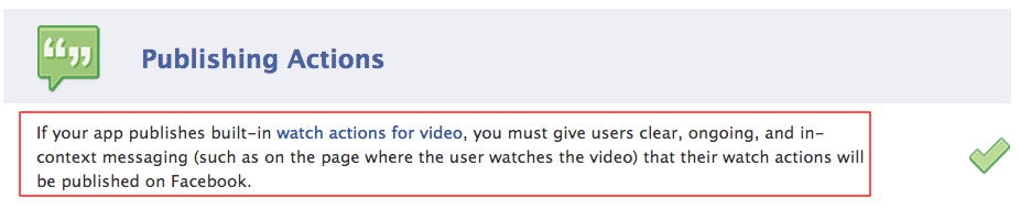 Here’s the exact text, with my emphasis added in bold: “Built-in watch and read actions can only be published after someone engages with the content for 10 or more seconds. If a video is shorter than 10 seconds, the viewer must watch the entire video.” For contrast, Facebook’s policy on providing sharing controls for most apps only says “You should allow people to turn sharing on or off for the content in your app, and the setting a user selects should persist.”