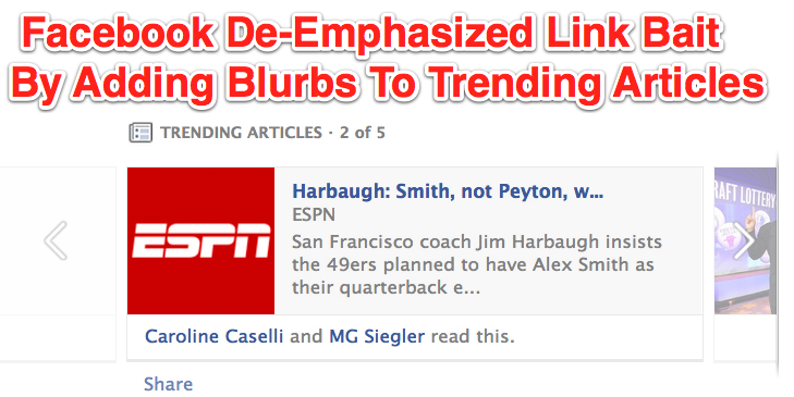 Beyond policy changes, Facebook has been tweaking how its displays auto-shared stories. It switched to a Trending Articles design that shows a blurb about a news article and not just link bait-prone headlines. Expect more product changes as Facebook adapts to emergent developer behavior.
