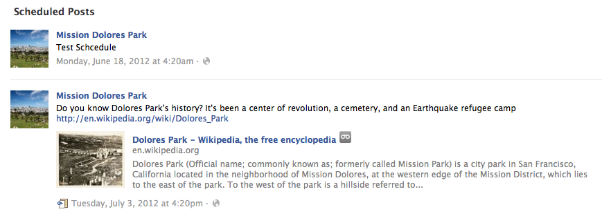 When admins with publishing privileges go to post, they can click a clock icon in the bottom left of the publisher to set a future date for the post to be pushed out. Scheduled posts then appear in the Manage->Use Activity Log section until they go live. However, you can’t edit scheduled posts beyond changing their publishing date, there’s no tagging to assist with analytics.