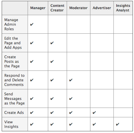 Page admins can now assign roles of Manager, Content Creator, Moderator, Advertiser, Insights Analyst, each with progressively fewer privileges as shown on the chart below. That means you could give an intern the ability to delete spam comments without letting them post to all your fans, or let a marketing manager buy ads for you without being able remove other admins or delete your Page. The cascading privileges aren’t quite as granular as some business might want though, as you can’t just give someone the ability to moderate but not advertise.