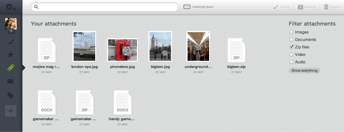 There’s also an attachment view which lets you visually search through emailed files, filtering for documents, images, zip files, audio, or video. These concepts are not new (remember Xoopit?), but they’re implemented in a way that makes you thump your head, wondering “why hasn’t someone done this before?” (For what it’s worth, Sparrow is also rethinking attachments in other ways that make sense.) Adams says that the attachment view, as it exists now, is only “a taste” of what’s to come.