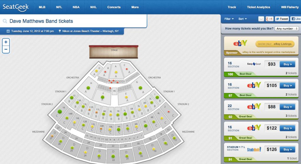 Now, if you go to AOL Music, for example, and you’re looking at Justin Bieber’s tour dates, clicking on any of the “Get Tickets” buttons will take you to the relevant SeatGeek page. (For the record: Using Justin Bieber as the example was SeatGeek’s idea, not mine.) The page includes a list of tickets available from a range of other sites including StubHub, eBay, and TicketsNow, and a map showing where all those tickets would actually seat you.