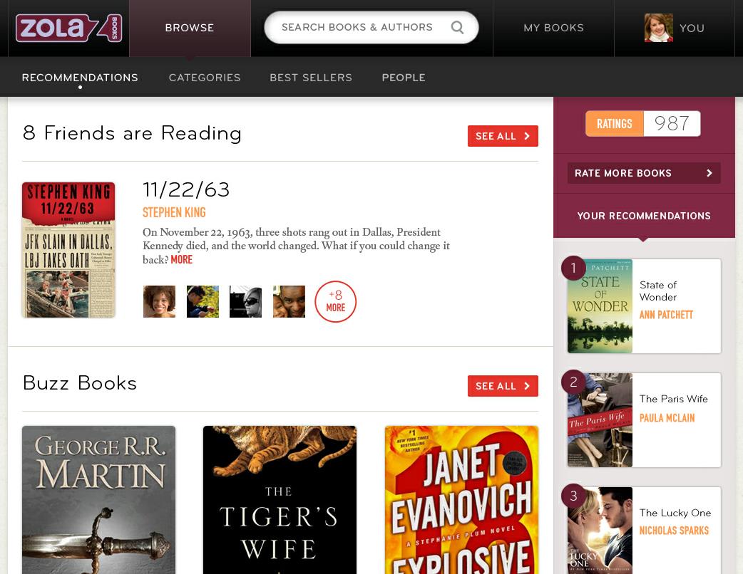 On Zola Books, recommendations play a central role. The site features standard, Amazon-like algorithmic recommendations, but the focus here is more on having publishers, authors and readers (be they individuals, book clubs or literary magazines) curate lists of interesting books. You can also see what your friends are currently reading. Users can highlight and comment on passages in any book and their friends will see these markups when they read the same book.