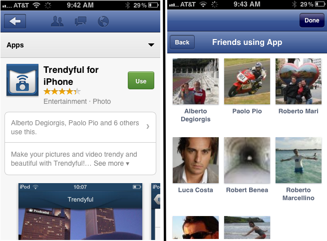 Clicking through to an app reveals a dedicated page listing what friends use it and what it does, as well as screenshots. You can click through to see photos of all your friends using the app, which could convince users that an app is worth their time. That’s really the strongest part of Facebook’s App Center and what sets it apart from Apple and Google’s marketplaces. On those you have to trust editors and the wisdom of the crowd, but with Facebook you get personalized suggestions based on people you trust.