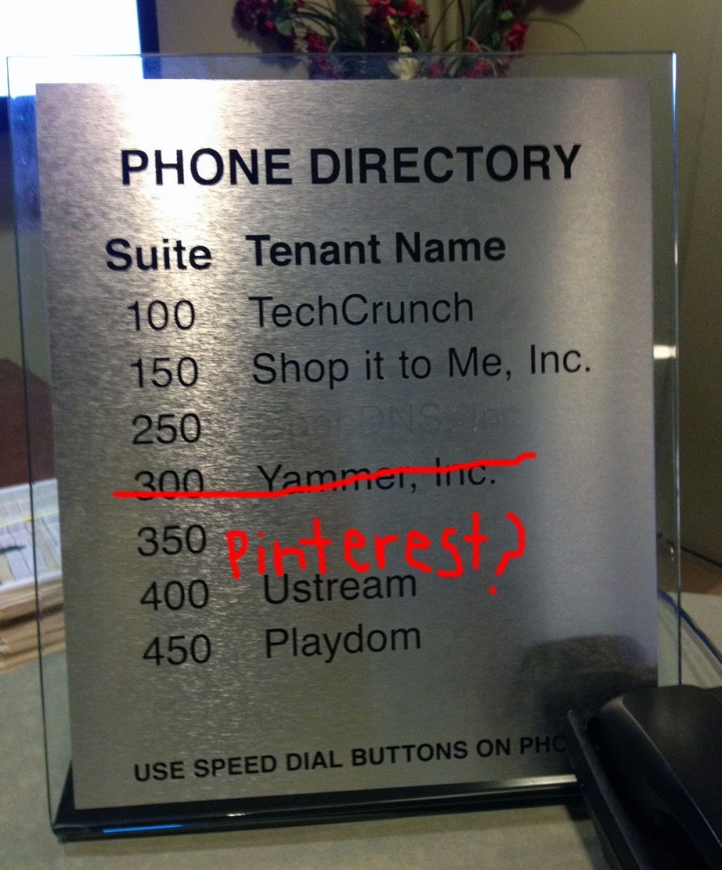 Rumors have being flying around the building that Pinterest is interested in the space (and/or taking over most of the building), and those rumors got a little bit more backup when I personally saw Pinterest CEO Ben Silbermann hanging out outside our building with a bunch of suits yesterday as I walked in to work, suits who I’m now assuming are somehow related to PMI Management, the owners of 410 Townsend.