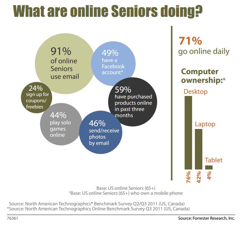 Online seniors, says Forrester analyst Gina Sverdlov, also highly value their mobile phones, but mostly for making calls. Only 22% of online seniors use their phones to access the Internet and only 7% of those who are online and own a mobile phone use mobile apps on a regular basis.