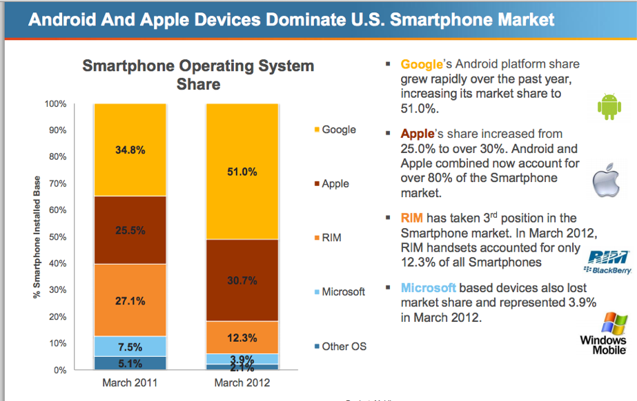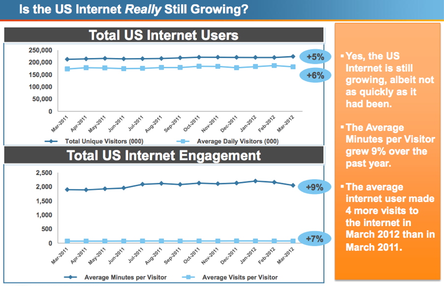 The report also examined the growth in mobile, and predicted that the number of mobile Internet users would surpass desktop Internet users by 2014. There’s been a 47% increase in smartphone users (106.7 million, or 45.6% of U.S. mobile population) between March 2011 and March 2012, said comScore, and Android now has 51% of smartphone market share, up from 35% last year.