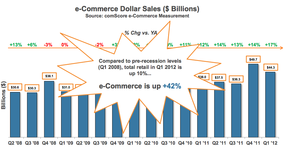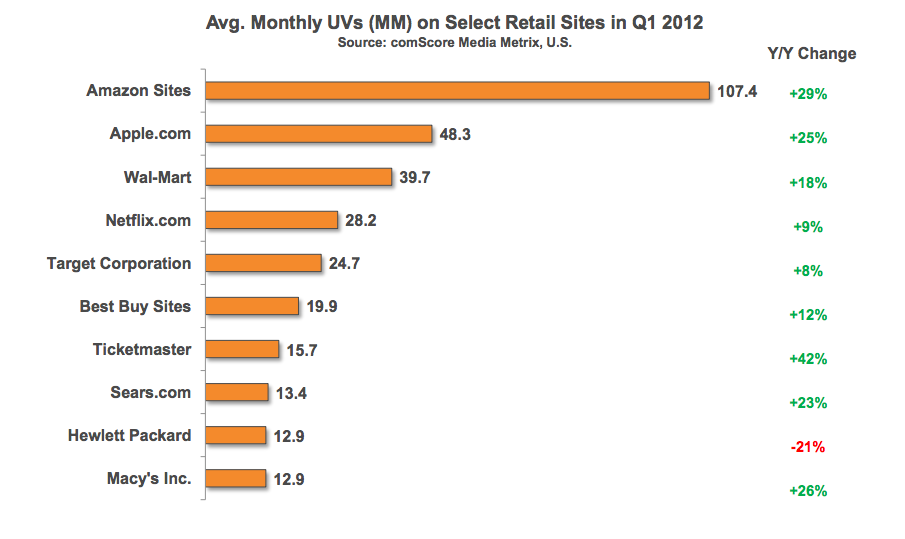 Switching over to e-commerce, comScore found that Amazon, Apple, Walmart, Target and Netflix were the top retail sites in Q1 2012, and that Amazon in particular has seen nearly 30% growth in unique visitors year-over-year. In terms of monthly uniques, Amazon was top and Apple ranked second.