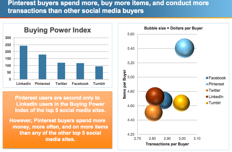 Pinterest’s growth was calculated using both unique visitors and clicks from search engines, said comScore, and it was found to be the fastest growing network in both categories. The network saw +4377% growth between May 2011 and May 2012, the firm reported. Meanwhile, Twitter grew less than 100% (58%). LinkedIn grew 67%, Tumblr 168%, and Facebook 4%. However, Facebook had the highest amount of reach during that same time by a longshot. Pinterest users were found to spend more, buy more items and conduct more transactions online than other social media buyers, but brands are still working out how to integrate their presence into the site for now.