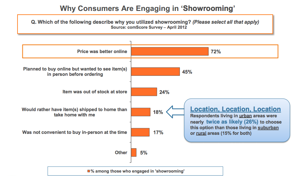 Online shopping has been impacting brick-and-mortar sales, too, thanks to what comScore dubs “showrooming,” which you know as the process of using offline retail stores to look at products up close, then buying online. Thirty five percent of people told comScore they had “showroomed,” but chose to buy online for better prices. Urban living was also cited as factor in this. Fifty percent of those engaging in this practice were 25-34 years old. The most popular categories for showrooming are consumer electronics and apparel, including both clothes and accessories.