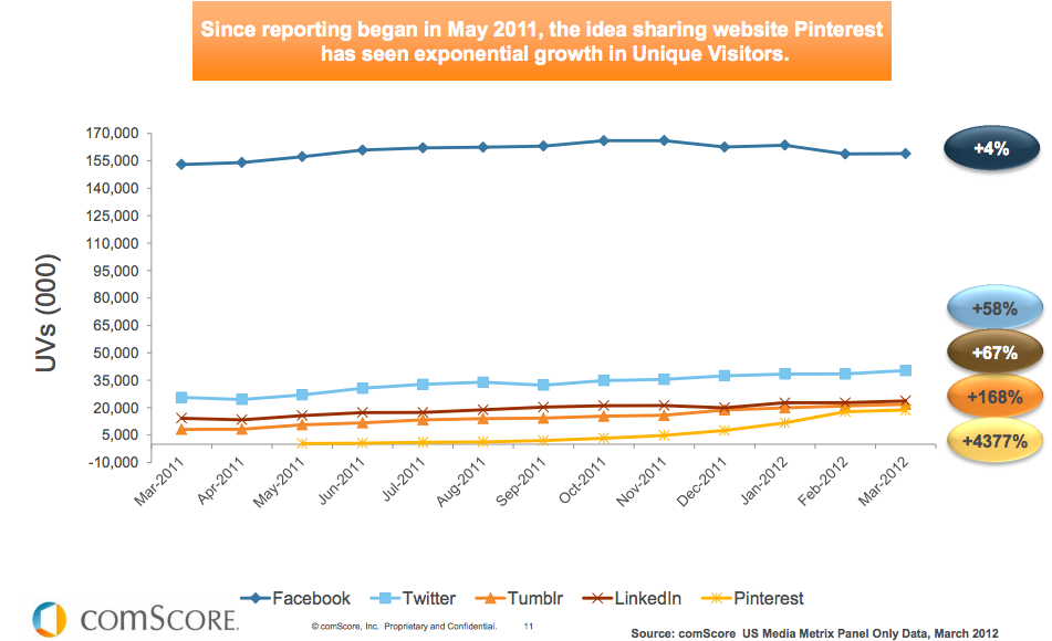 In a report being released today, measurement firm comScore says that unique visits to social networking sites have increased by 6% year-over-year. The company also re-confirmed that Pinterest remains the fastest-growing social network as of Q1 2012, and its users rival only that of LinkedIn in terms of buying power.