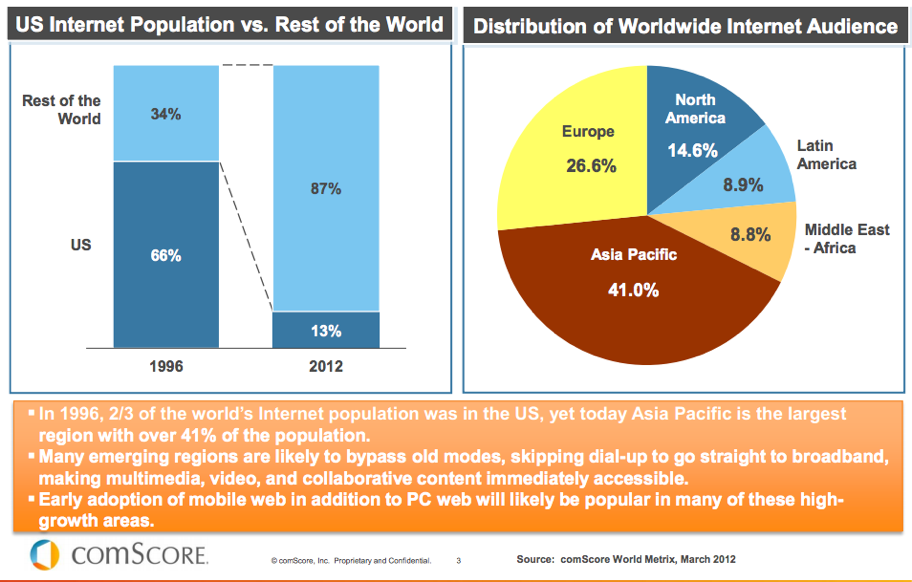 The presentation began with a look at how the U.S. population relates to the rest of the world, before diving into other data. Today, the U.S. only account for 13% of the online population, down from 66% in 1996. However, the population is growing and remains engaged.