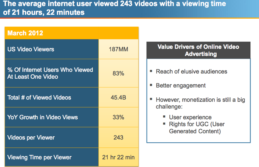 It also found a rise in viewing of longer form video ads, but monetization was still a challenge. In March, 45.4 billion videos were viewed by U.S. users, averaging 243 video per viewer, and representing 33% year-over-year growth.