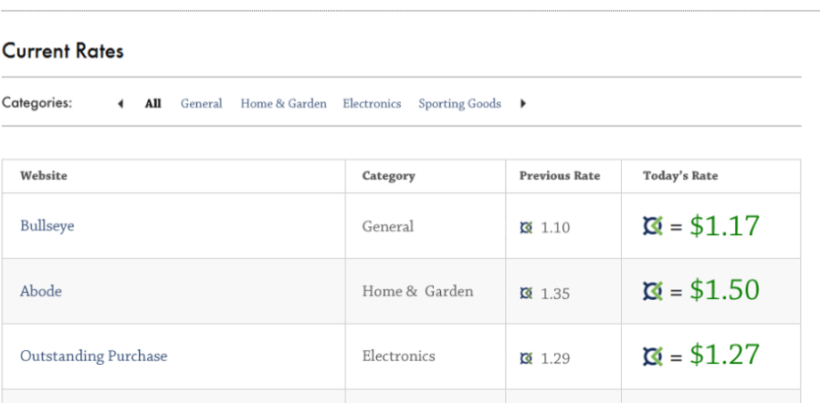 Now one of the best things about currency exchange is arbitrage. Here’s where that comes in. Look at the list below. Each of those are exchange rates. But like mini-Pyongyangs, each website is in control of its own exchange rate. Parity can be 1 to 1 to the dollar or Amazon can offer 1.25, essentially offering a considerable discount on everything they sell. Kurrenci takes a small percentage of these “discounts” as payment for customer discovery.