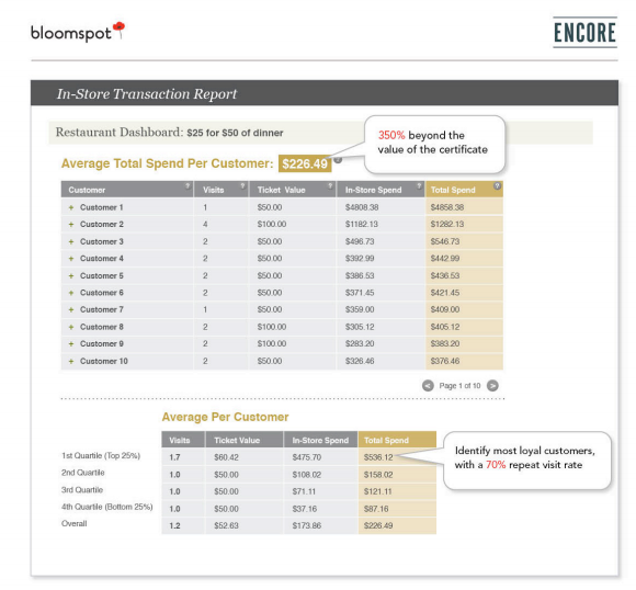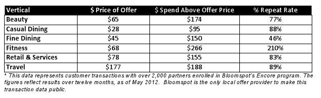 The data was sourced through Bloomspot Encore (Bloomspot’s opt-in rewards program which tracks credit card data), and it reflects actual consumer interactions from approximately 150,000 members and approximately 2,000 merchants in Bloomspot’s core markets. The company delved into average repeat rates, overspend, averages by vertical and anonymized data by merchant.