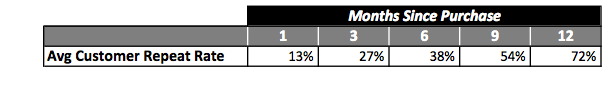 In its analysis of repeat customers, Bloomspot tracked visits over 1, 3, 6, 9 and 12 months. Over the 12-month period, it found that 72% of customers returned local merchants on average, as you can see below. But even after one month, 13% customers had returned.