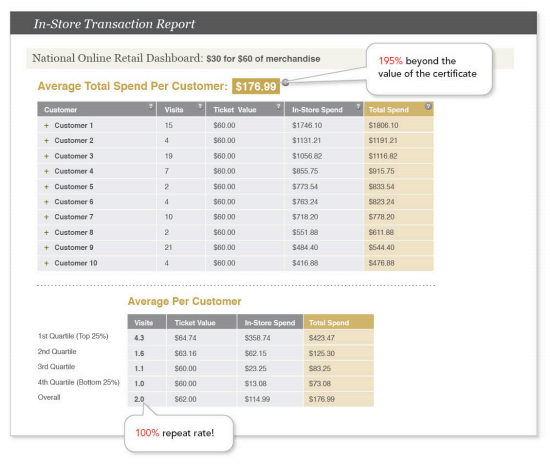The company also found that the average overspend per customer is approximately $140 over the year, and that customers spend above the price of the certificate by on average $60 in the first month.