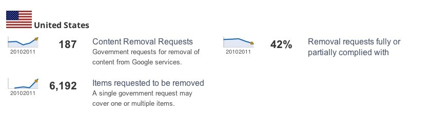 For the last two years, Google has been releasing data about requests to remove content and hand over user data from government agencies around the world. Late last night, the company released the latest set of this data, which covers the second half of 2011. In it, Google notes that it received 187 content removal requests from U.S. government agencies, asking for the removal of 6,192 items across the company’s product portfolio. To put this into perspective: in the first half of 2011, Google was only asked to remove 757 items in the U.S. and only received 92 removal requests. Google complied with 42% of these requests.