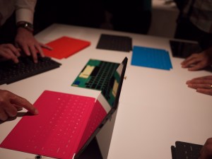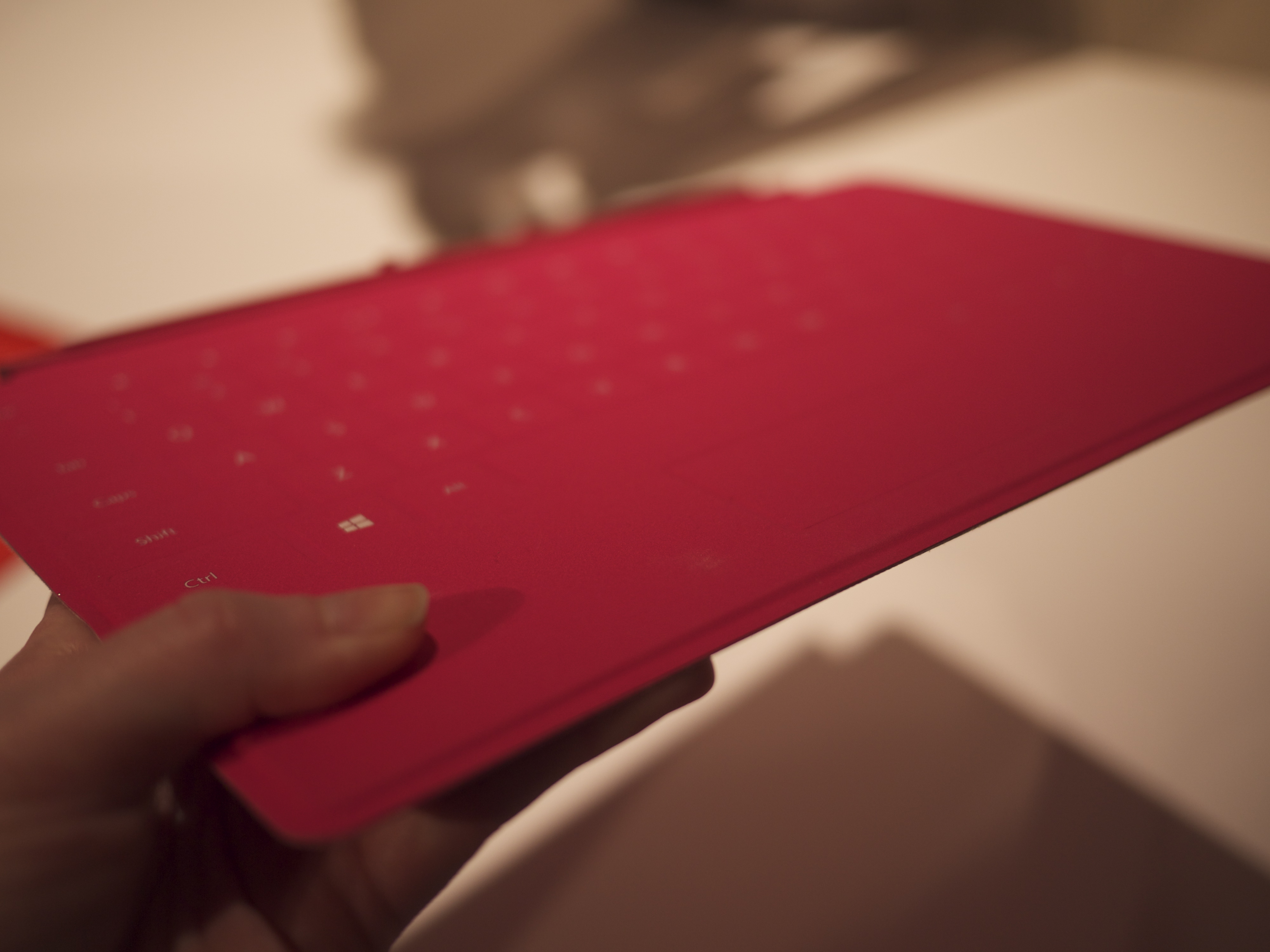 Next we looked at the included cover, which doubles as a touch keyboard. It has a soft rubbery feeling, but the keys don’t compress when you touch them. It also does not bend at all, unlike iPad covers — obviously, as it does more than just cover the screen. Microsoft says it made the hinges and cover to give it a bookish feeling. They come in several different colors.