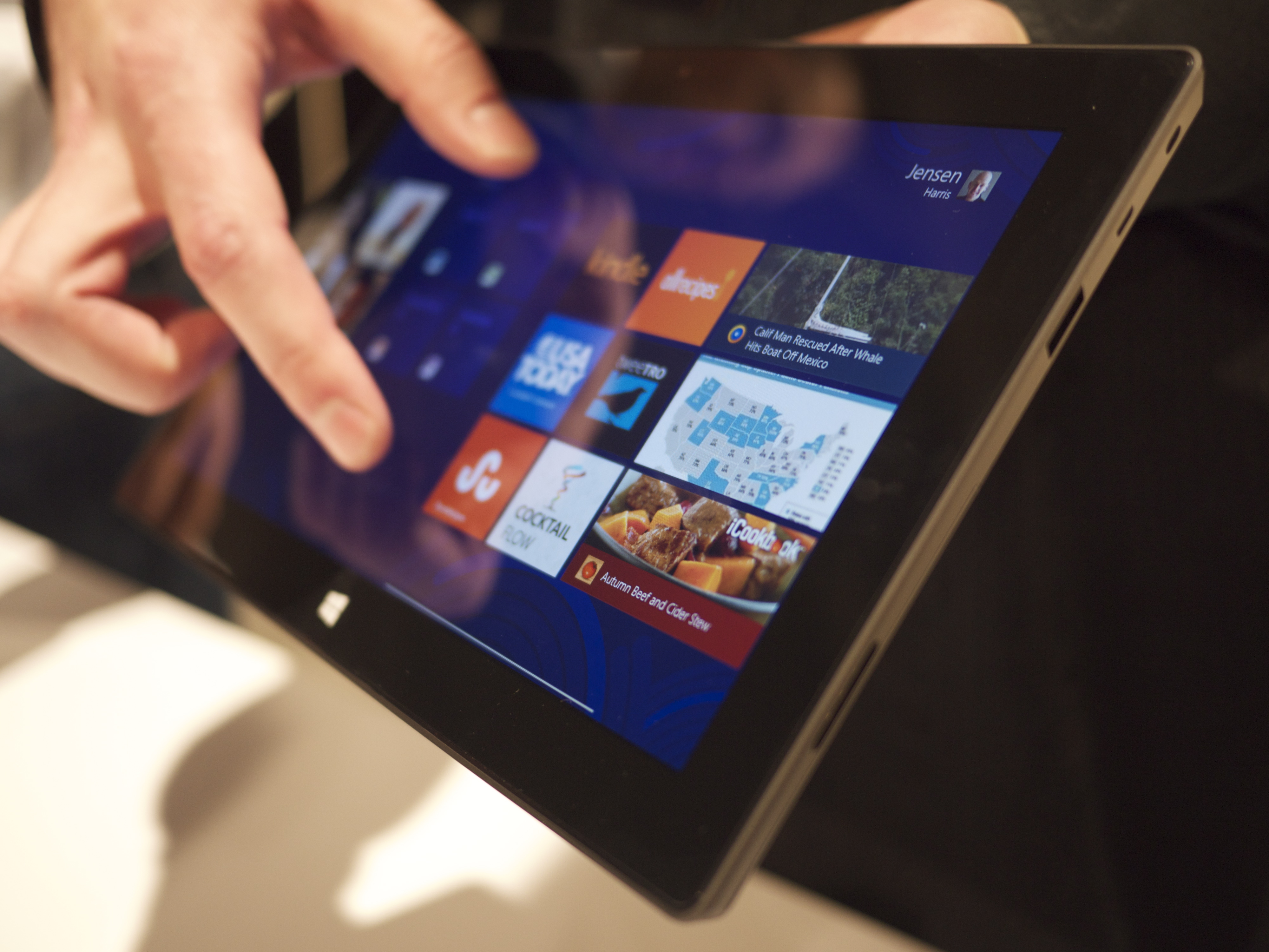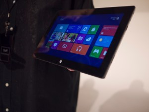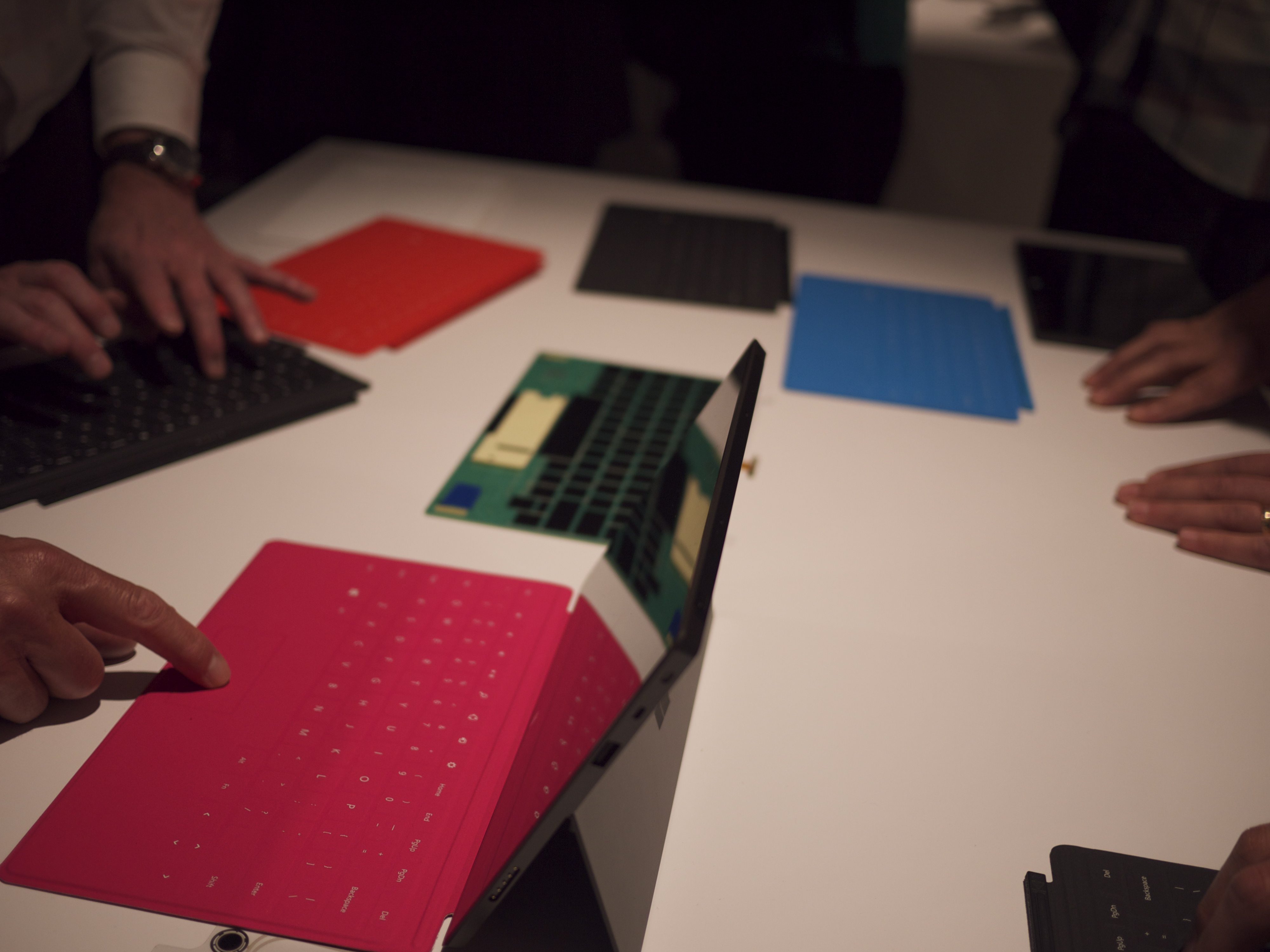 First we got a look at the kickstand that’s built in to the Surface, which is a clear differentiator from the iPad, for which users have to buy separate accessories. The kickstand was made to click in and out on the tablet with ease and style, and a satisfying “snap” sound — the company says it spent lots of time developing the three hinges that make it work, modeling them after the doors on a luxury car.