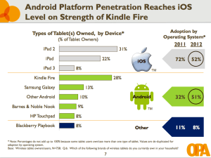Apple has captured mindshare in the tablet market with its iPad, but when it comes to actual usage, in the U.S. it is actually neck-and-neck with its chief rival, Android, according to a new study out (direct link here) from the Online Publishers Association. The group found that while iPad ownership outweighed that of Android tablets in 2011 — 72 percent to 32 percent — this year those shares have evened out, at 52 percent vs. 51 percent, with a large part of that Android boost coming from the Kindle Fire.