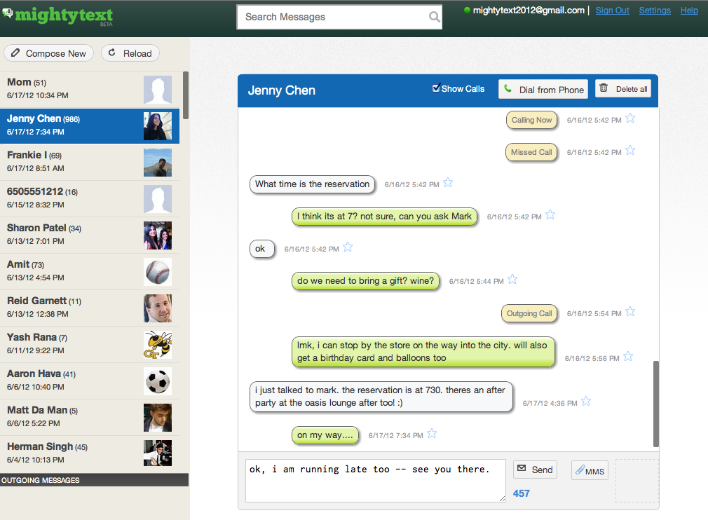 So, in allowing users to SMS, MMS and make calls anytime, and from anywhere, it’s not hard to see the initial value prop for MightyText. But what’s important to note is that the app syncs with your existing Android number, which means you don’t have to get a new one — unlike Google Voice. (Huzzah!) And since MightyText lives in the cloud (and in your browser), it organizes all your texts, picture messages and calls, allowing you to search and store them securely for as long as needed. Much in the same way that Gmail (et al) organizes (using the term loosely), categorizes, and allows you to search through you email.