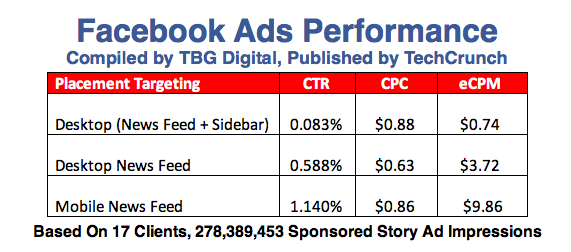 According to a new study by TBG Digital on 278,389,453 Sponsored Story ad impressions across 17 clients, mobile news feed Sponsored Stories (the only ads Facebook shows on mobile) have a stunning click-through rate of 1.14% at a $0.86 CPC. That means Facebook earns $9.86 per 1000 impressions (eCPM), and that could actually rise as more advertisers realize the power of mobile Sponsored Stories and compete for impressions there.