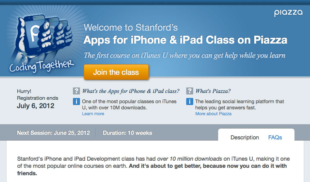 Stanford’s iOS class saw over 10 million downloads for individual lecture videos so far, making it one of the most popular online courses around. The collaboration with Piazza, sais Brent Izutsu, the program manager for iTunes U at Stanford, will hopefully enhance learning and unleash some of the “enormous potential for collaboration and community-building though Q&A and problem-solving with friends from across the globe.”