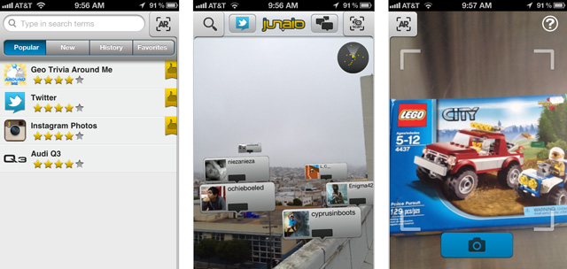 The new version of Junaio, launching today, has made some major progress in simplifying the UI. Its new interface is much cleaner now and lets you get right to the camera view when the app starts up so you can immediately start scanning AR content, targets or QR codes.