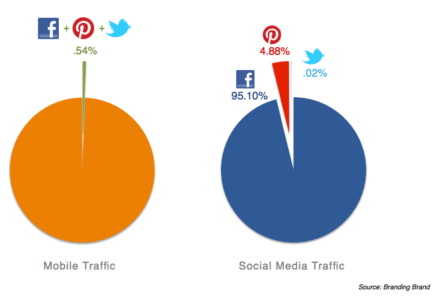 Social media, as a whole, was responsible for less than 1% of the total visits to the retailers’ mobile sites, Branding Brand found, with Facebook providing the majority of the referral traffic. Facebook sent the clients 95.1% of the social media-driven mobile visits, Pinterest sent 4.88% and Twitter 0.2%.