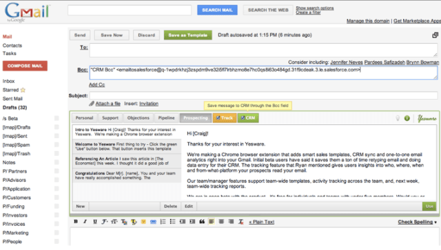 The company, which makes a suite of services that work in Gmail and on mobile, offers an alternative way to input to CRM systems and integrates with professional CRMs like Salesforce.com, Microsoft Dynamics, Oracle CRM, Highrise and others. However, Yesware can be also be used as standalone product by smaller businesses or individuals.