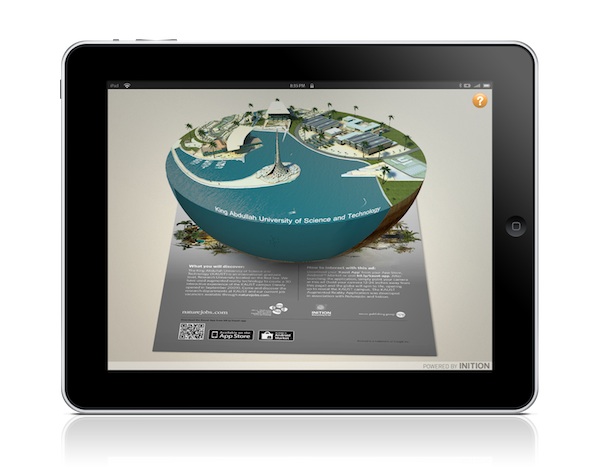 Nature Publishing Group teamed up with the King Abdullah University of Science and Technology to run an augmented reality advertising campaign. Point your tablet or smartphone at the print advertisement and watch the beautiful KAUST campus spring to life before you! You can click on the various departments, “talk” to virtual students, and peruse job openings hosted at Naturejobs.