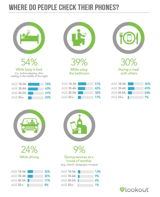 The dedication to using one’s phone has also meant that we are using them everywhere. The most common place? While in bed (54%), with on the toilet being a close runner-up (39%), and while eating in third (30%).