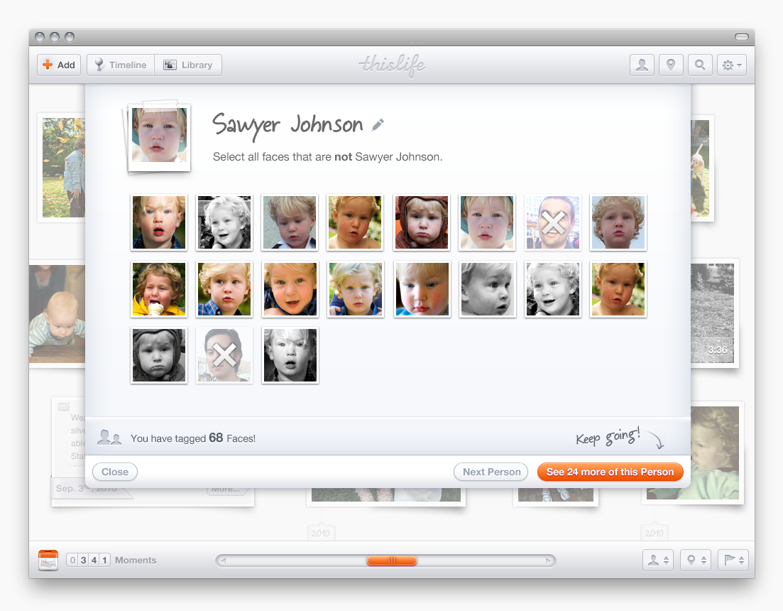 Once photos are uploaded, ThisLife has a very robust facial recognition technology to identify people in various photos. That’s critical for families using the service. CEO Andrea Johnson told me that one of the most difficult problems for that technology is differentiating between young siblings, not to mention adapting to changes as children grow older. In a demo, for instance, she showed a timeline of one of her kids from eight weeks to eight years old.