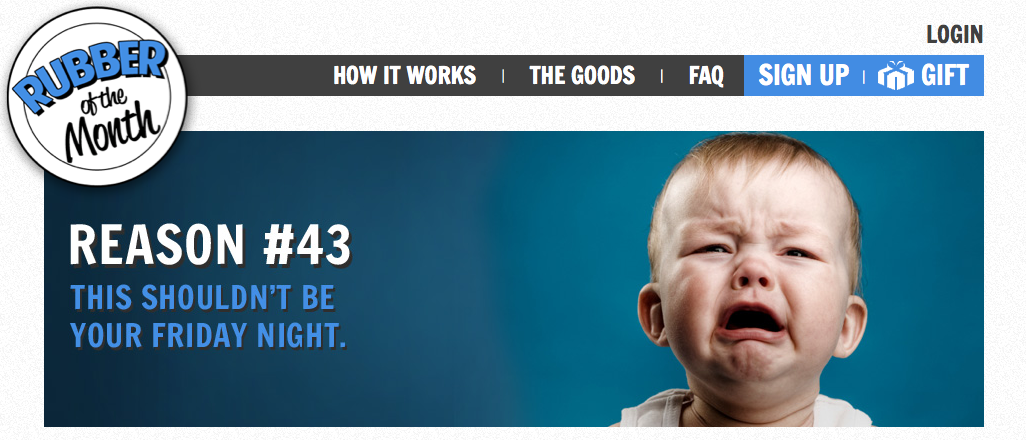 Now why would anyone subscribe to a service that sends you condoms by mail once a month? Dollar Rubber Club touts, “No more embarrassing trips to the drug store. No more funny looks from that pimple-faced kid behind the counter.” Rubber of the Month Club, meanwhile, has a number of different “humorous” reasons that pop up each time you show up on the site. Like Reason #25: Nobody wants to drive a minivan. Or this: